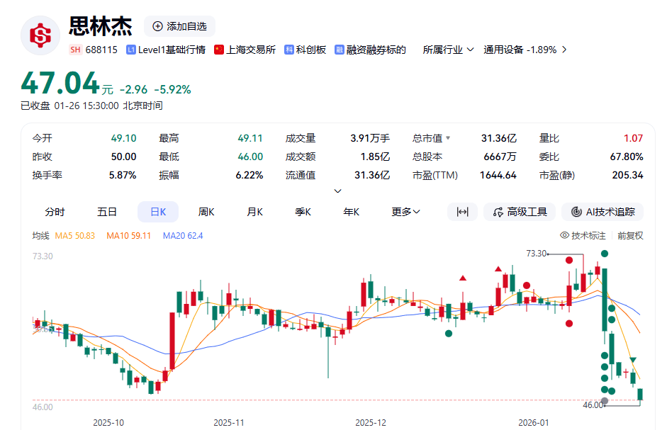 受终止收购信息影响=▽-,截至1月26日收盘,思林杰报47.04元/股,下跌5.92%,总市值31.36亿元。