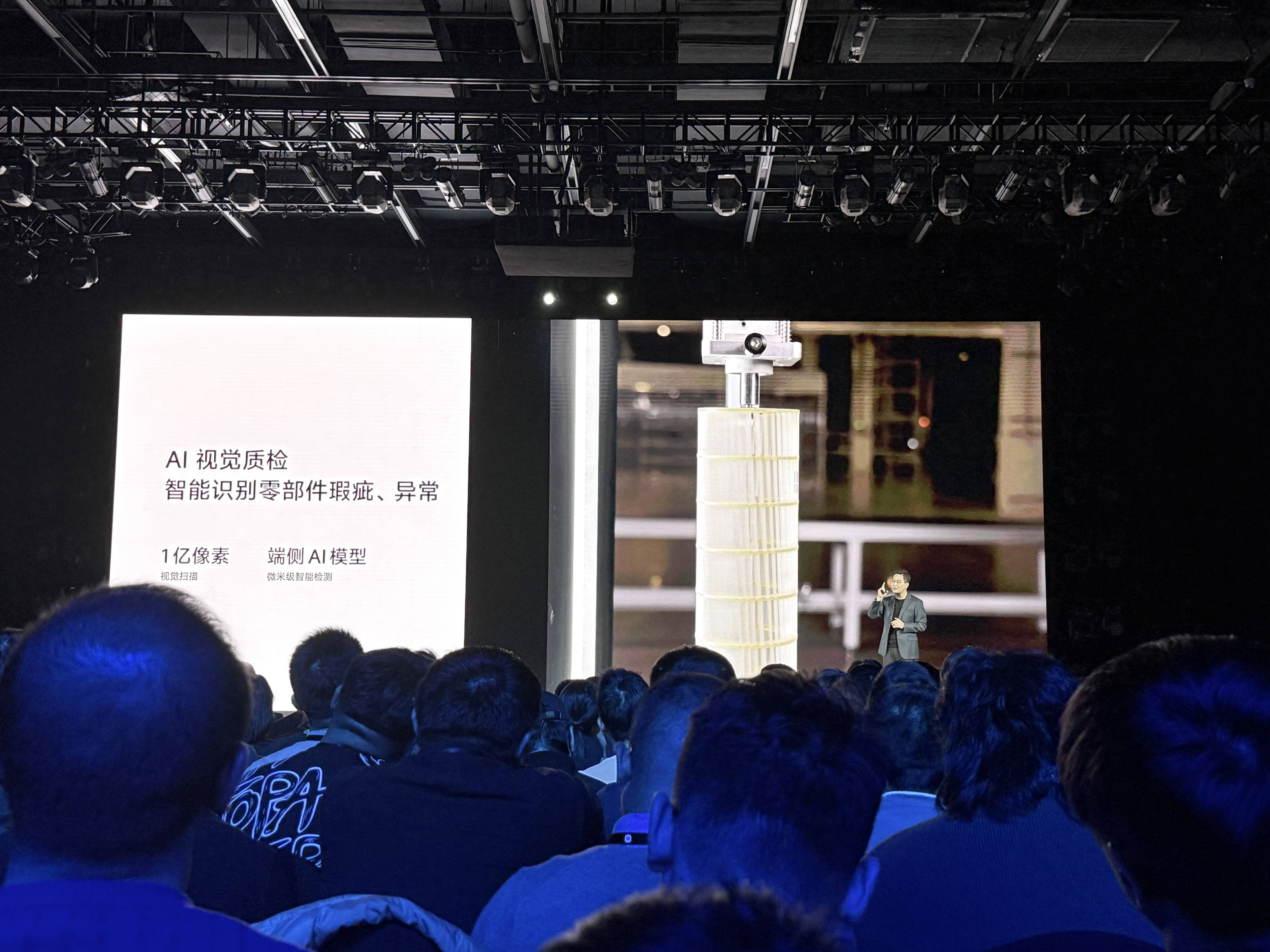目前小米智能家电工厂的注塑车间、钣金车间黑灯产线台AMR子导航机器人高自动化,其智能物流覆盖率达到94%。卢伟冰称●,这使得在小米智能家电工厂6.5秒就可以下线一台高端空调。此外,该工厂基于1亿像素视觉扫描,端侧AI模型视觉识别、日常检测,小米智能家电工厂在整机、关键零部件都做到100%质检。