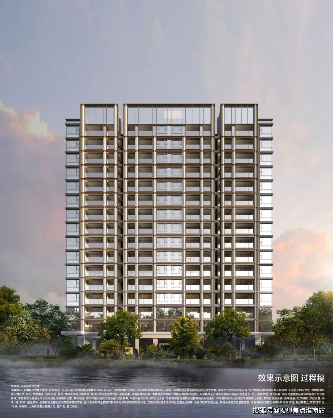 材质:局部温润石材、仿铜铝板、仿石铝板及局部仿石涂料,竖向铝板提升品质感