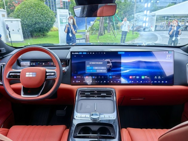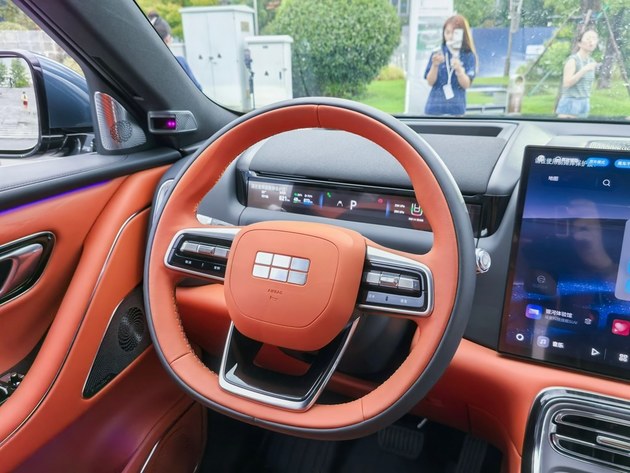 进入车内我们可以看到,一股浓郁的科技风扑面而来•,采用非对称的T字型中控台设计。主驾驶配带鱼屏仪表+带有加热功能的三辐式方向盘。中控屏和副驾屏相连…=,成为一整块超大智慧屏。