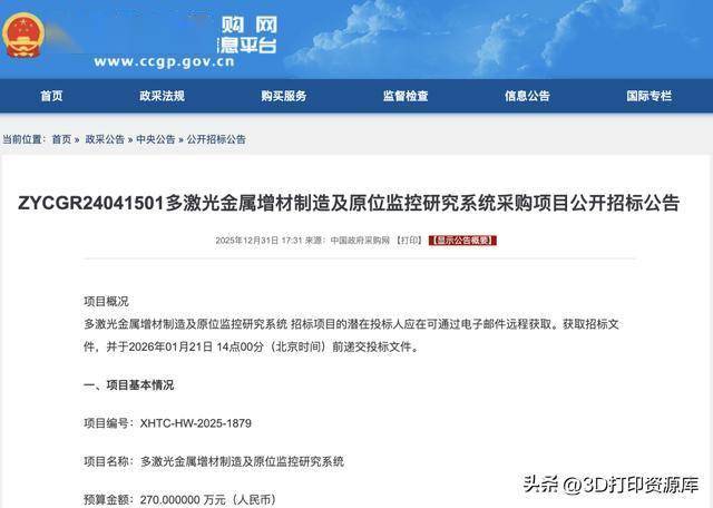 2025年12月31日,据中国政府采购网信息,ZYCGR24041501发布了项目编号XHTC-HW-2025-1879的多激光金属增材制造及原位监控研究系统发布采购公告,项目预算270万元□-…。