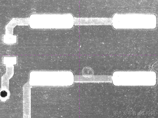 同轴光通过特殊的半反射镜将光线反射到相机的透镜轴方向▷▼,只让从物体表面反射并垂直于透镜的光线通过。这样能使物体表面结构特征成像更为突出■●=,其广泛用于半导体、精密制造等领域的零件检测。下图为金属件表面浅凹槽使用环光和同轴光效果图对比。