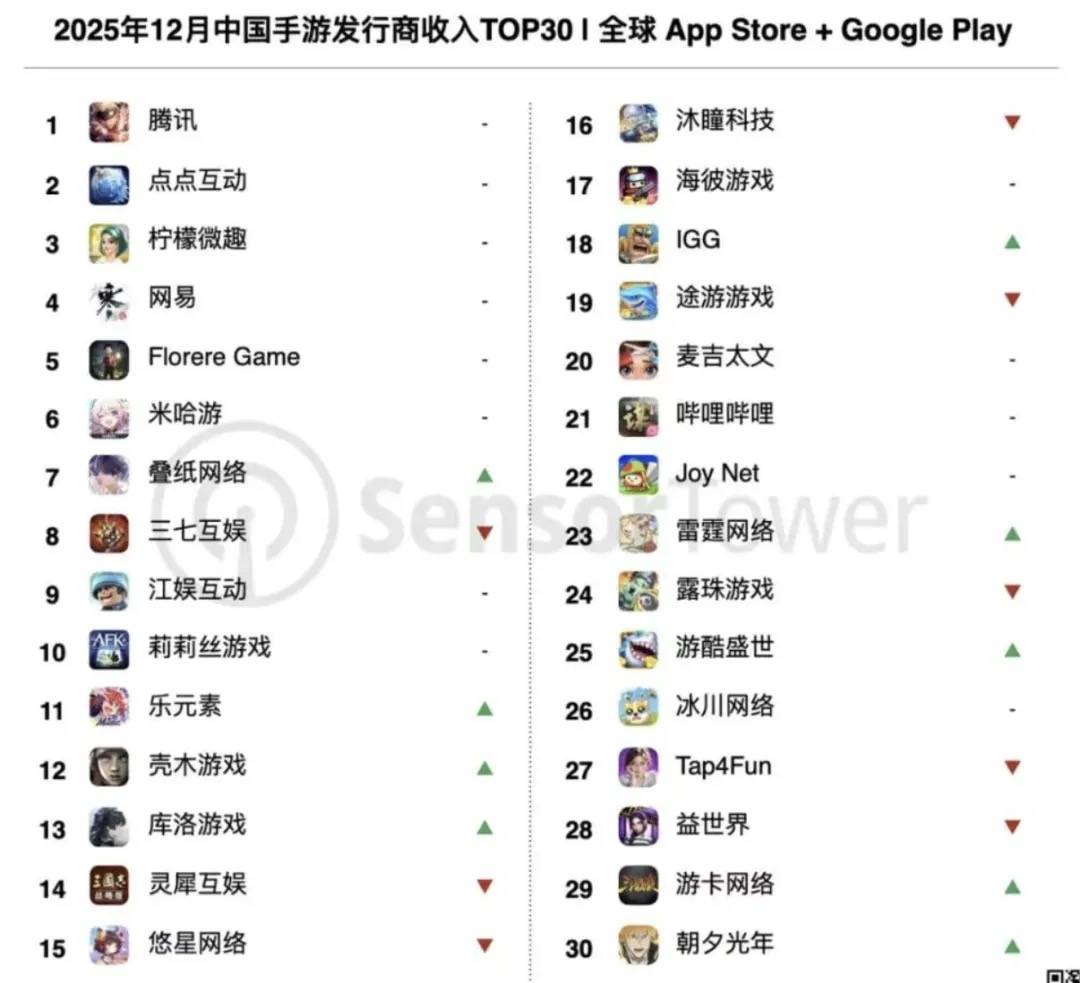 在中国 App Store 去年 12 月手游收入榜中,腾讯旗下《王者荣耀》《金铲铲之战》《三角洲行动》《和平精英》包揽前四□▼。