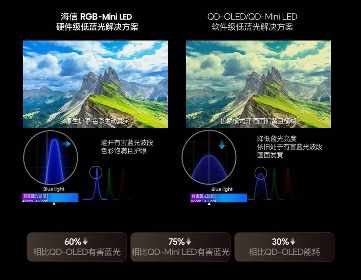 与此同时,海信全新一代RGB-Mini LED技术实现了有害蓝光比QD-OLED降低60%,比传统QD-Mini LED降低75%,能耗降低30%,在拥有极致画质的同时■▲,让护眼与节能终可两者兼得○。