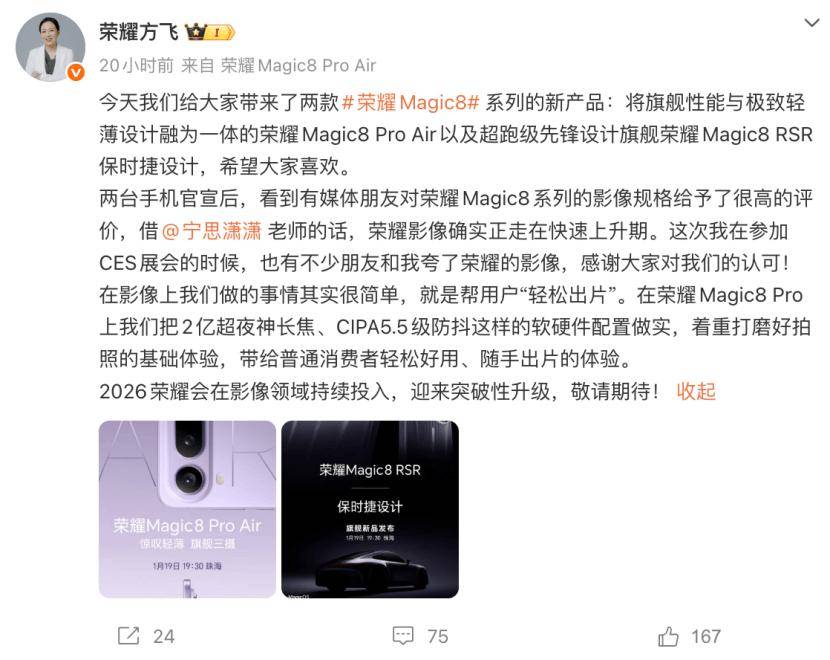 从 2025 年 10 月荣耀 Magic8 系列发布并提出“8848 巅峰旗舰”概念,到如今荣耀 Magic8 RSR 保时捷设计以 CIPA 6.5 级防抖和专业影像套装压轴登场,荣耀的产品进化逻辑清晰可见◇★•。正如荣耀方飞所言▼▲▪:“在影像上我们做的事情其实很简单,就是帮用户‘轻松出片’。在荣耀 Magic8 Pro 上我们把 2 亿超夜神长焦…•○、CIPA5.5 级防抖这样的软硬件配置做实○,着重打磨好拍照的基础体验,带给普通消费者轻松好用、随手出片的体验-。2026 荣耀会在影像领域持续投入,迎来突破性升级。”