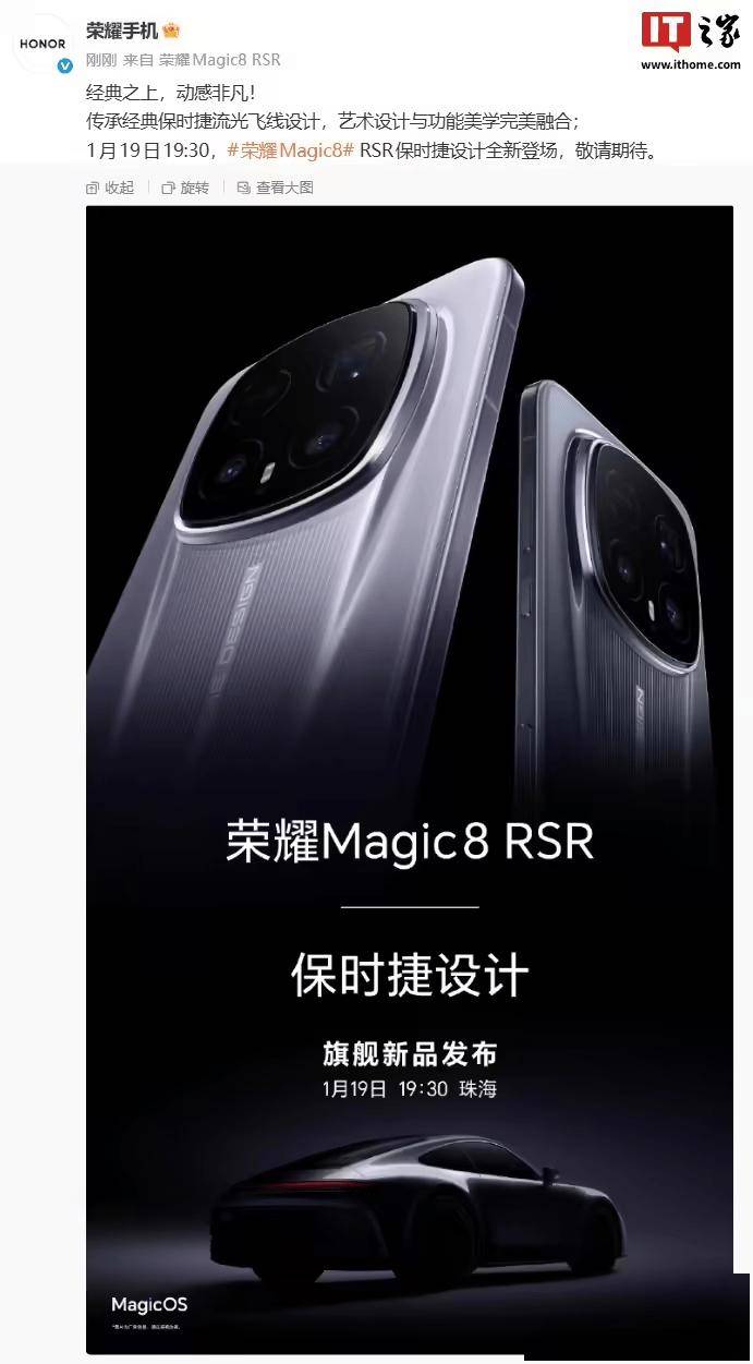 据悉,新品已定档 1 月 19 日 19△•:30 正式发布。在智能手机影像竞争日益白热化的今天,荣耀 Magic8 RSR 保时捷设计凭借 CIPA 6.5 级防抖与专业影像套装的组合拳,势必将重塑顶级影像旗舰的竞争格局。