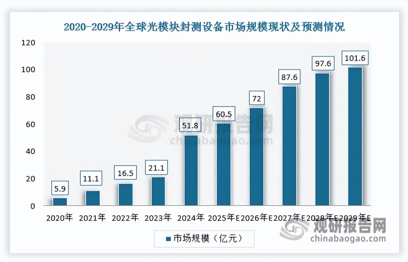 受益于AI算力需求爆发◁•,全球光模块封测设备市场呈现跨越式增长。据根据数据,全球光模块封测设备行业市场规模从2020年5▽▪.9亿元增至2024年51.8亿元,年复合增长率达71.8%☆,其中800G光模块设备市场规模从2022年0.1亿元激增到2024年30.2亿元,成为增长最快的细分领域。