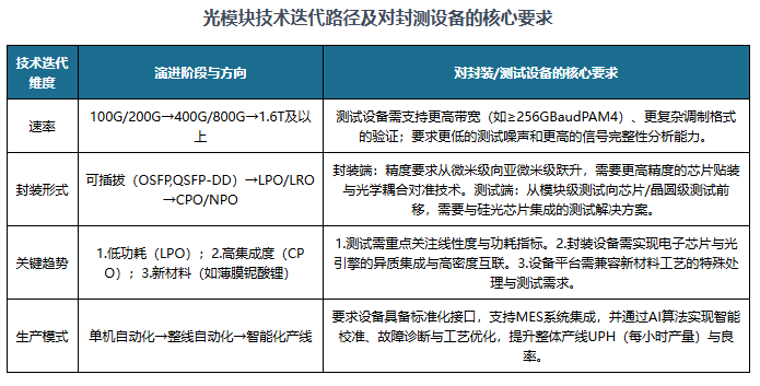 其次,技术迭代不断加速▽,光模块在速率与封装形式上快速演进,每一次升级都对封测设备的精度、效率和自动化水平提出了更高要求。