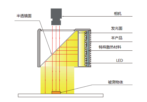 同轴光源是采用 LED 高密度阵列和半透镜组合设计而成,与相机光学轴的方向均匀照射。能够有效克服产品表面反光,更好的体现物体表面的不平整。
